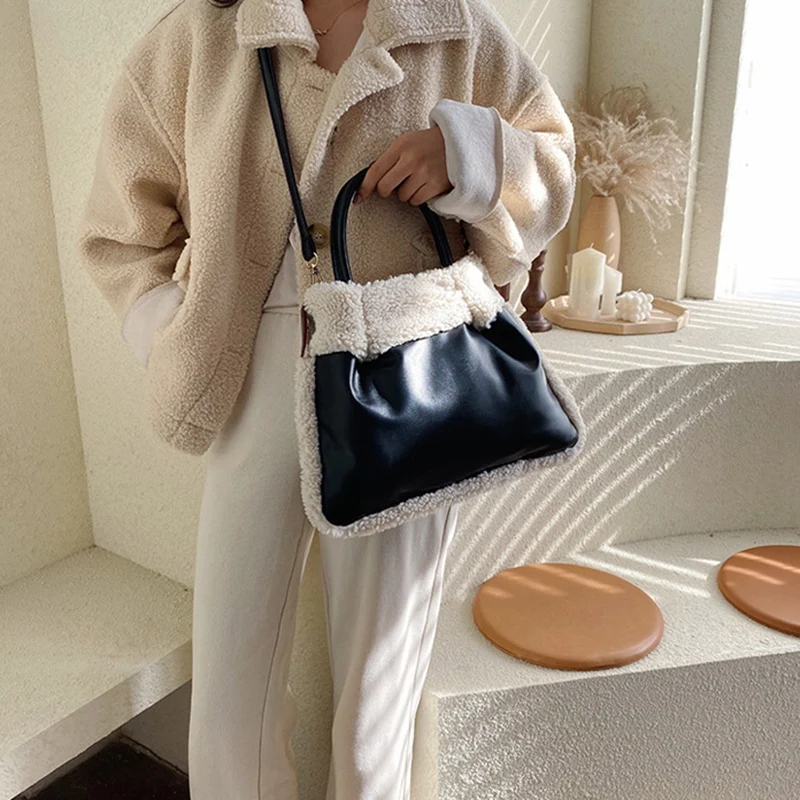 Discount Fashion Lamb Cashmere Women Handbags Plush Shoulder Bags Pu Leather Crossbody Bag Large Capacity To